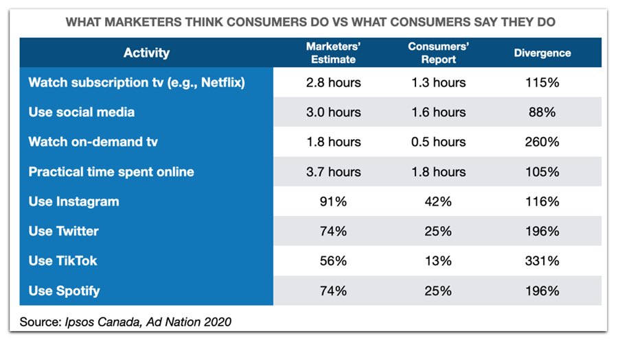 One other point needs to be noted here. According to data from Ipsos Canada and the Ad Nation 2020 report, a clear gap remains between what marketers think consumers do as opposed to what they actually do. Divergence from marketers’ estimates on Instagram, Twitter and TikTok use ranged from 116%, to 196%, to 331% respectively. While influencer marketing remains a significant tool with ROI gradually being proved, it it also important to keep a sense of perspective.