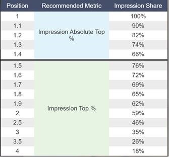 The easiest way to set your targets is to look at recent performance for campaigns across the three impression % (rate) metrics and use this as a starting point. This will ensure the smoothest transition from targeting a position to targeting impression share.